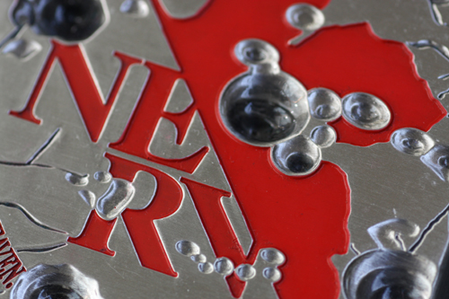 ヱヴァンゲリヲン新劇場版:Qに登場する印象的な1シーン、銃弾に抉られた壁の傷ついたネルフマーク。