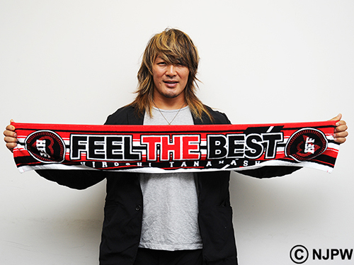 棚橋弘至選手の新マフラータオルは大人気の「FEEL THE BEST」Tシャツをモチーフに、コスチュームカラーでまとめたデザイン!