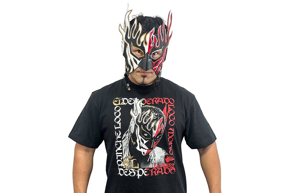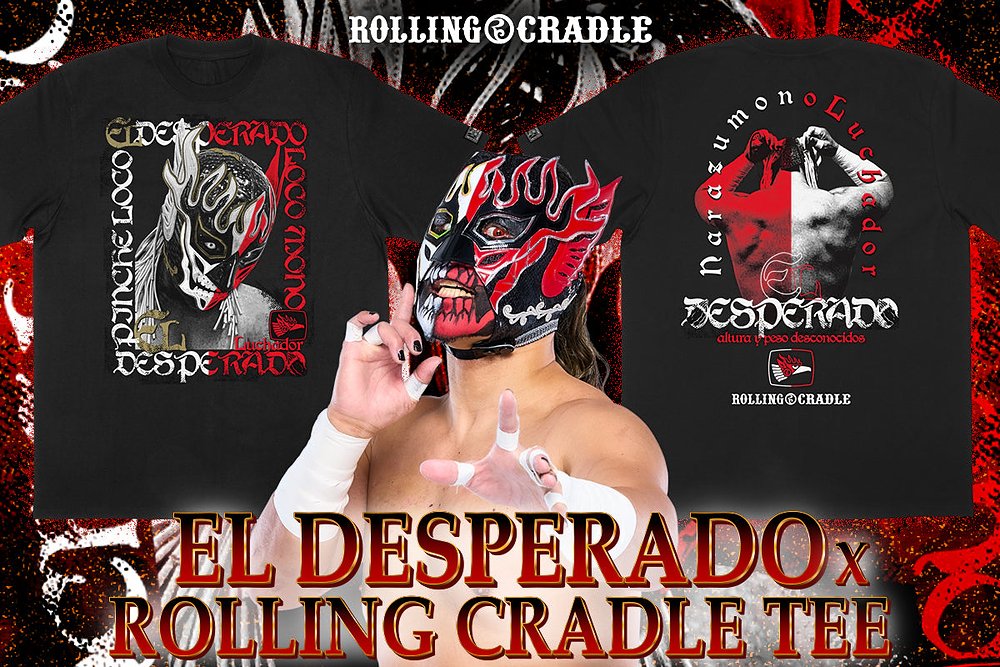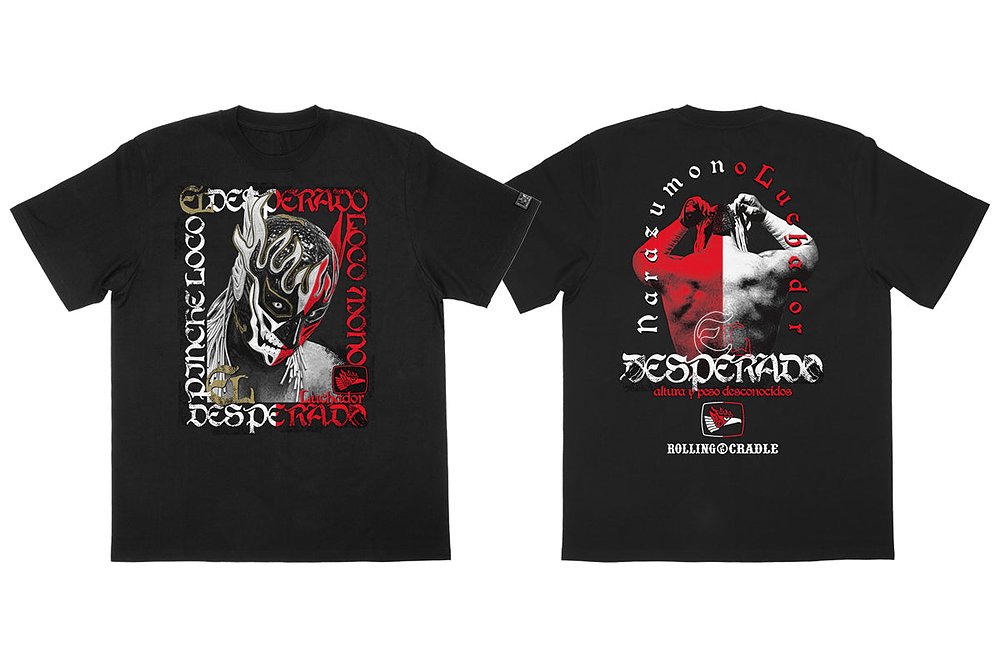 2021年に発売されて以来、ロングランで人気の「エル・デスペラード×ローリングクレイドル」コラボTシャツに、白赤ハーフマスクをイメージした【ブラック×ホワイト×レッド】バージョンが登場!